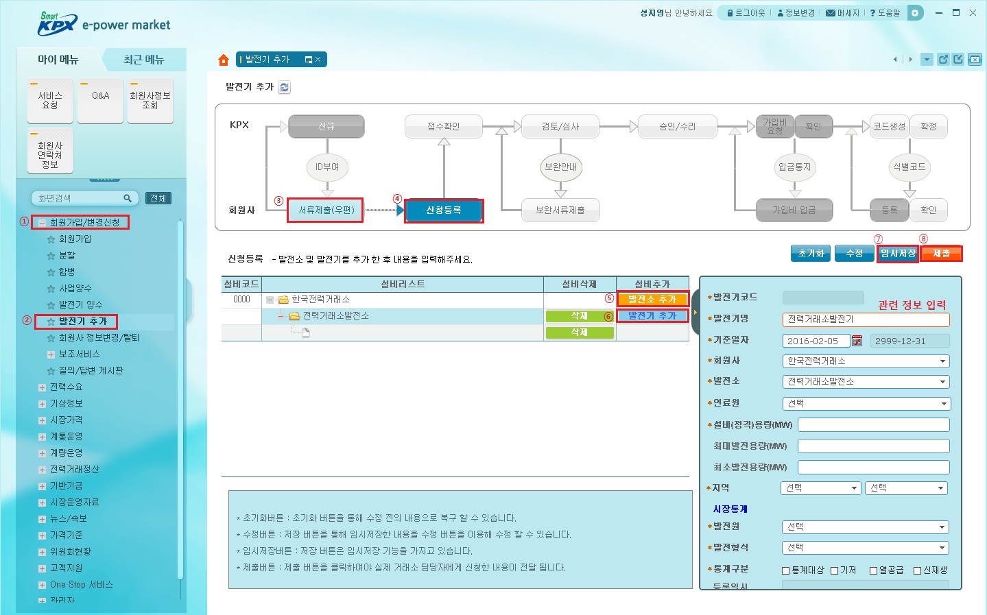 - [회원 및 전력시장]메뉴 - [발전기 및 ESS 등록신청] - [발전기 추가] - [ESS 선택]